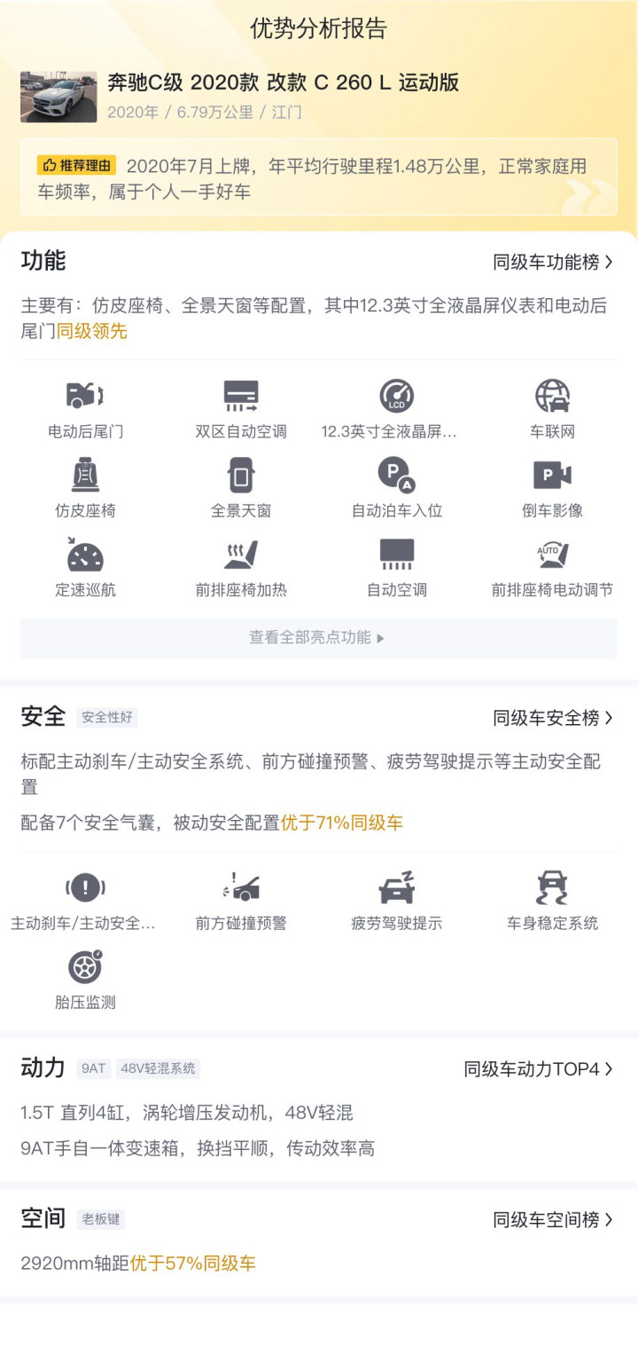 奔驰C级 2020款 改款 C 260 L 运动版搭载了1.5T 184马力 L4 48V轻混发动机,最大功率135kW,最大扭矩280N·m,电动机总功率10kW,电动机总扭矩160N·m,百公里加速时间为8.5秒,最高车速236km/h。传动系统匹配的是9挡手自一体变速箱。NEDC综合油耗为6.1升/百公里,WLTC综合油耗无相关信息。纯电续航里程信息未提供,WLTC续航里程同样暂无数据。该车定位为中型轿车,车身尺寸4784x1810x1457(mm),轴距2920mm,为乘客提供宽敞的乘坐空间。行李舱容积未给出具体数值,但描述为“规整”,可能暗示其在同级别车型中的表现不错。座椅采用仿皮材质,既保证了乘坐的舒适度又提升了内饰的质感。全景天窗为乘客带来了更加开阔的视野,同时也有助于提升车内采光效果和通风性能。驾驶位座椅记忆功能则方便了不同驾驶者之间的座椅设置切换。多媒体系统支持蓝牙/车载电话、语音识别控制系统等功能,满足了驾驶者和乘客的娱乐需求。基础安全配置包括主动刹车/主动安全系统、前方碰撞预警、疲劳驾驶提示等主动安全配置,以及7个安全气囊/帘组成的被动安全配置,为乘客提供了全方位的安全保障。前后驻车雷达和倒车影像系统进一步提升了停车的安全性和便捷性。总的来说,这款车凭借其出色的驾驶体验、宽敞舒适的乘坐空间以及丰富的智能互联功能,在同级别车型中具有较强的竞争力。